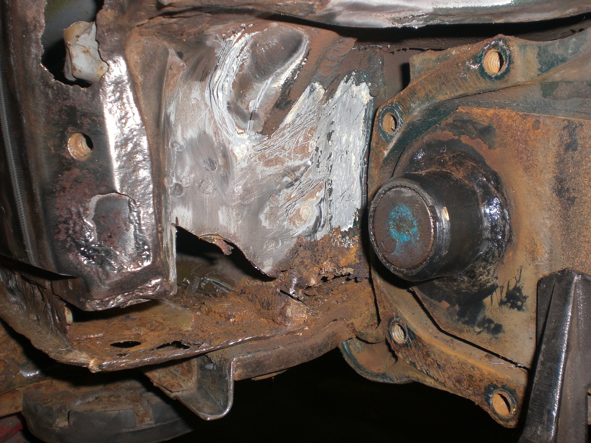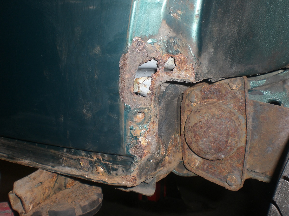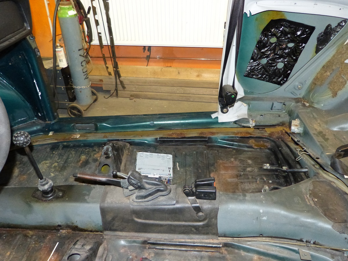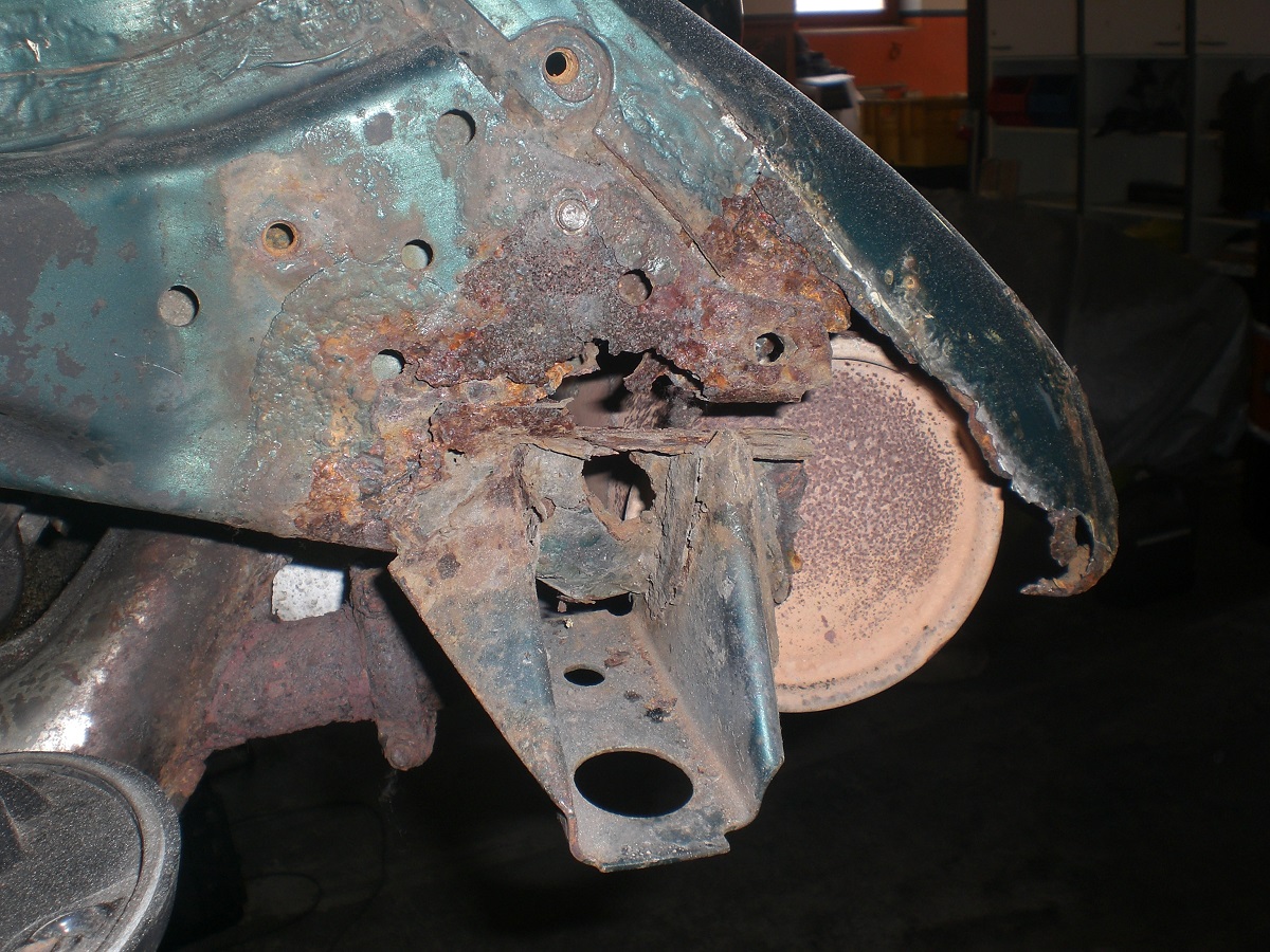 Als weitere „kniffelige“ Stelle stellte sich der Bereich vor der hinteren Achsaufnahme heraus. Hier war unterhalb des Heizkanal- Verbindungsstück im Innenraum das Häuschen angefressen. Ein Bearbeiten von der Außenseite ist ebenfalls nicht möglich, da der Bereich von der Hinterachsaufnahme abgedeckt ist….