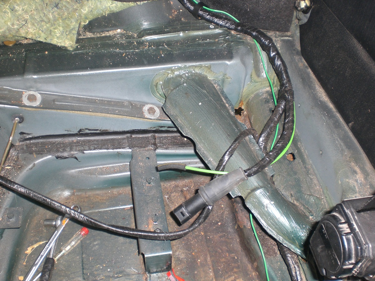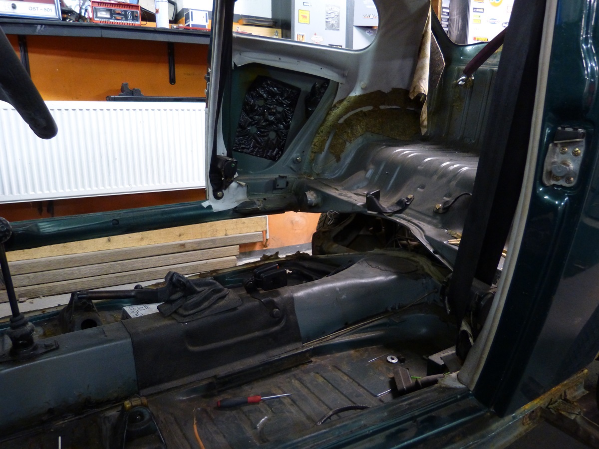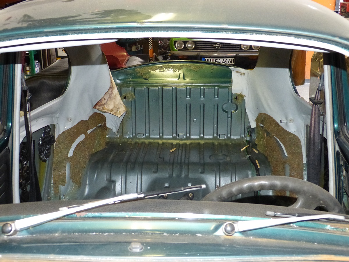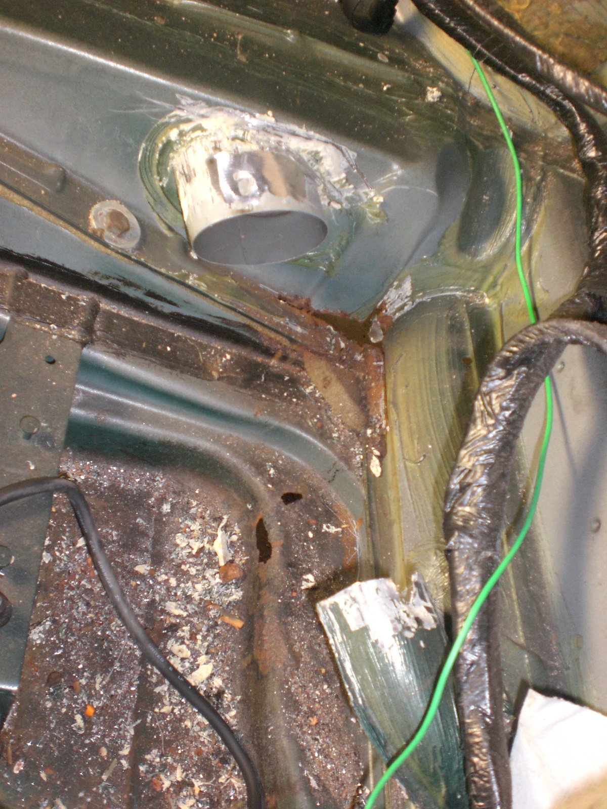 Als weitere „kniffelige“ Stelle stellte sich der Bereich vor der hinteren Achsaufnahme heraus. Hier war unterhalb des Heizkanal- Verbindungsstück im Innenraum das Häuschen angefressen. Ein Bearbeiten von der Außenseite ist ebenfalls nicht möglich, da der Bereich von der Hinterachsaufnahme abgedeckt ist….