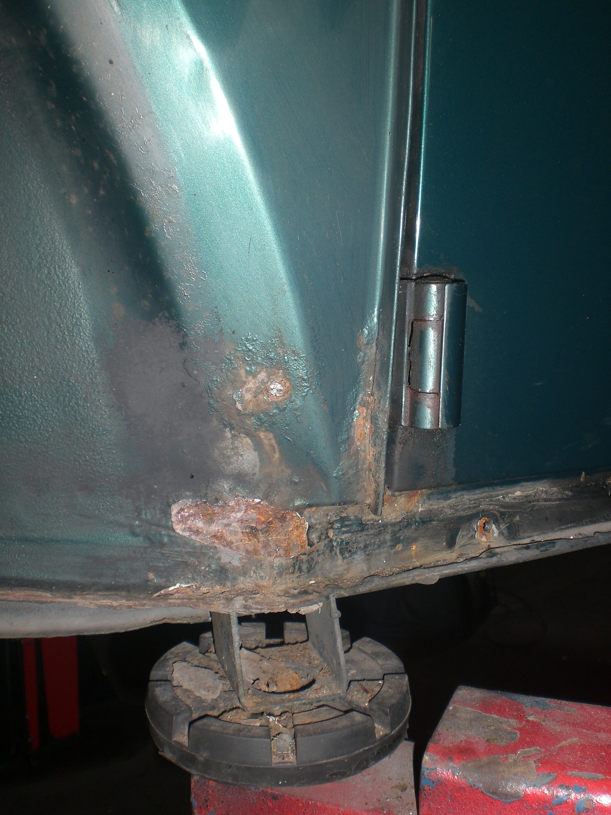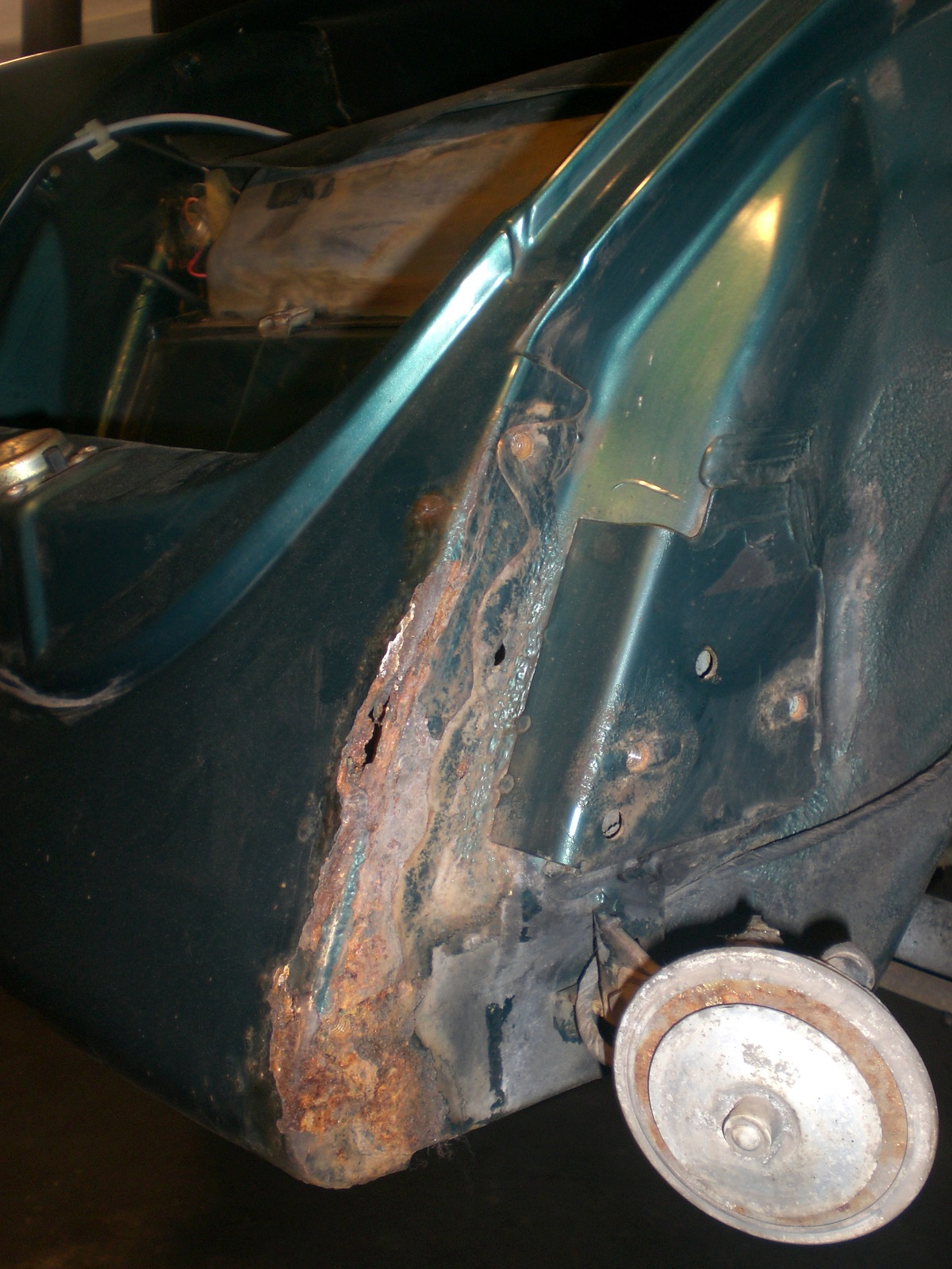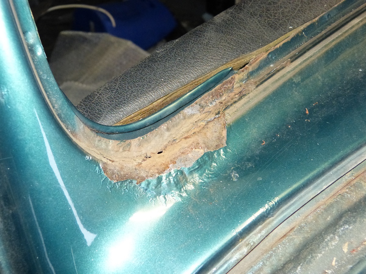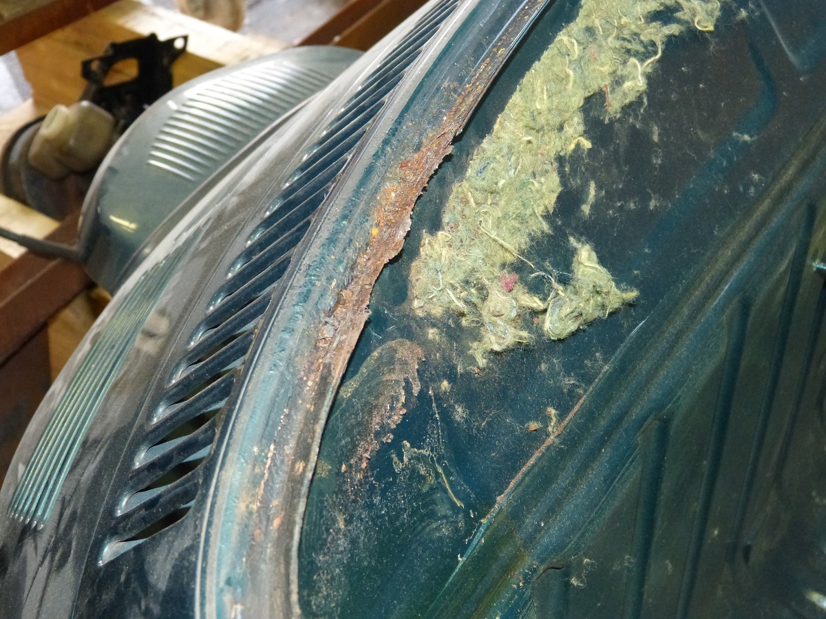 Als weitere „kniffelige“ Stelle stellte sich der Bereich vor der hinteren Achsaufnahme heraus. Hier war unterhalb des Heizkanal- Verbindungsstück im Innenraum das Häuschen angefressen. Ein Bearbeiten von der Außenseite ist ebenfalls nicht möglich, da der Bereich von der Hinterachsaufnahme abgedeckt ist….