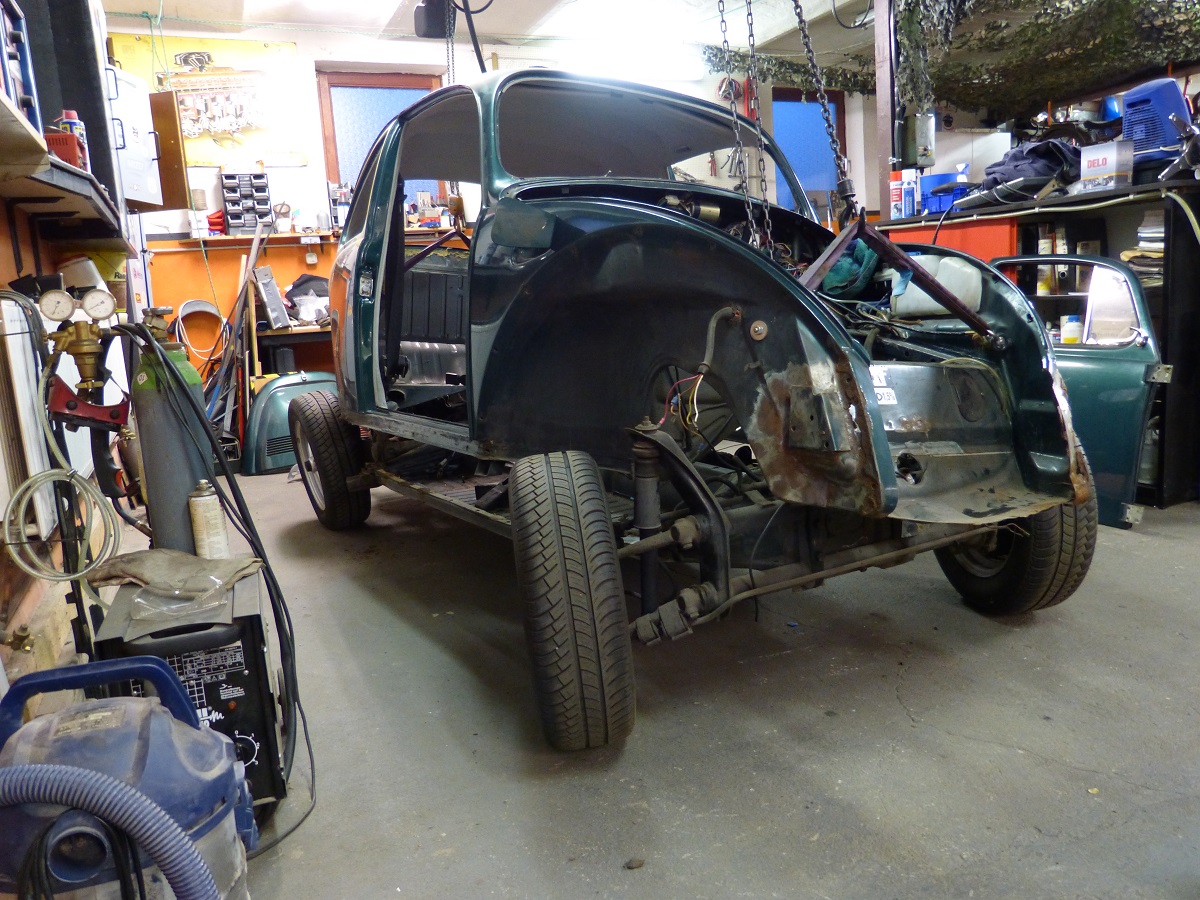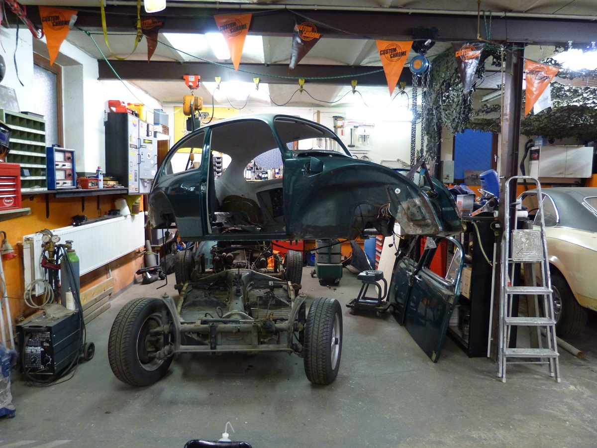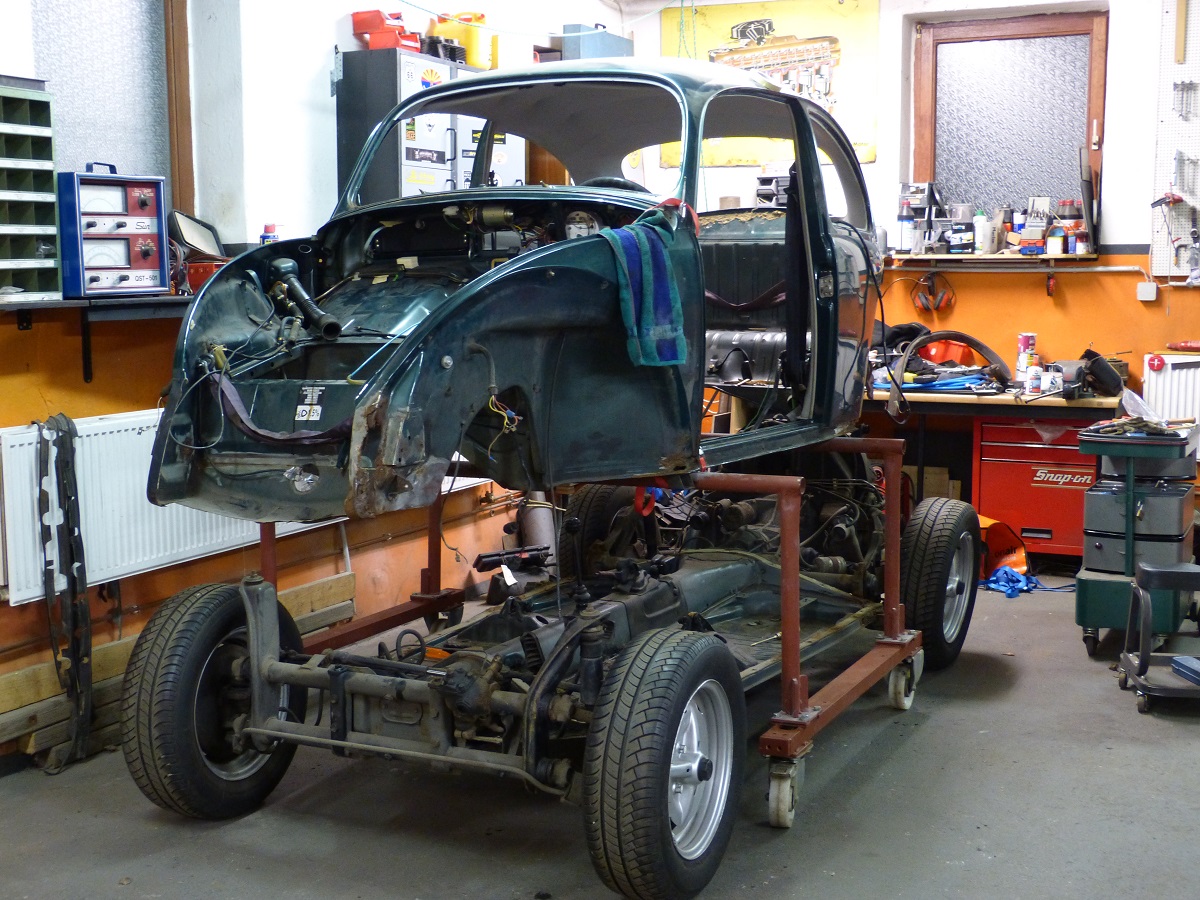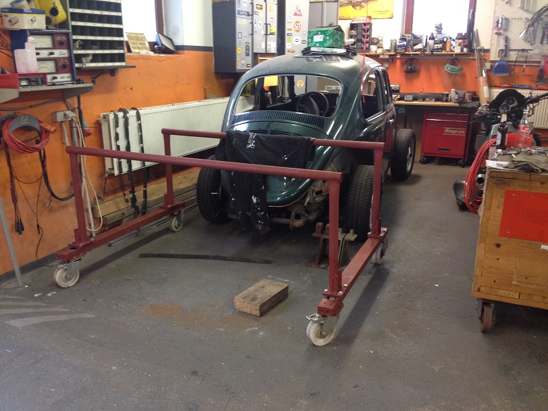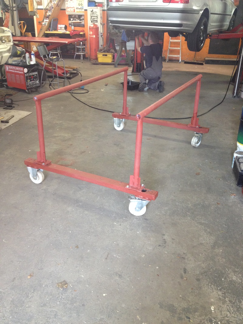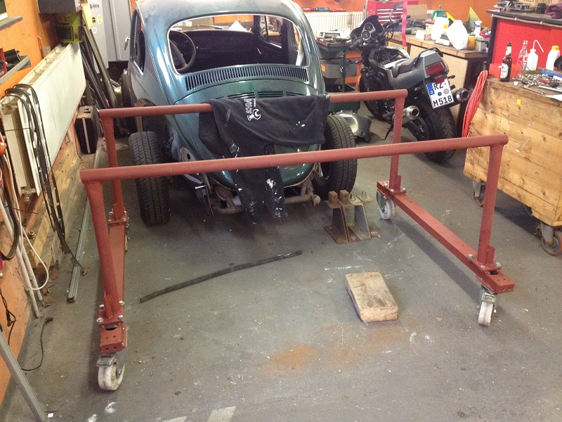 Um der Platzproblematik Herr zu werden, habe ich mir ein Gestell für das abgenommene Käferhäuschen überlegt, dass sich derzeit noch im Bau befindet. Mit diesem Rollgestell kann ich das Häuschen zum Bearbeiten/Schweißen bequem umherrollen und zum Lagern dann über der Bodengruppe parken!