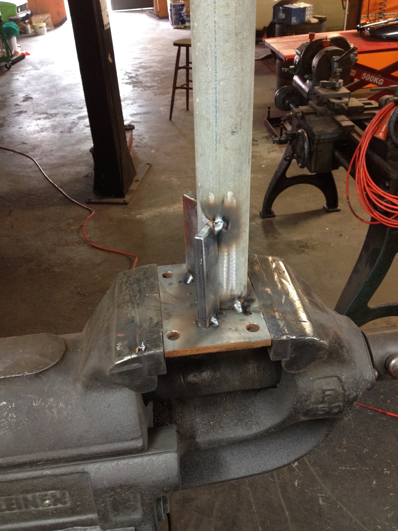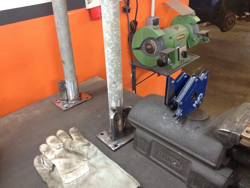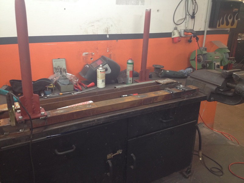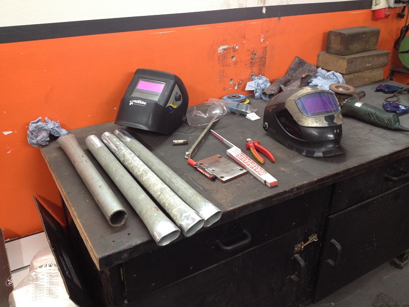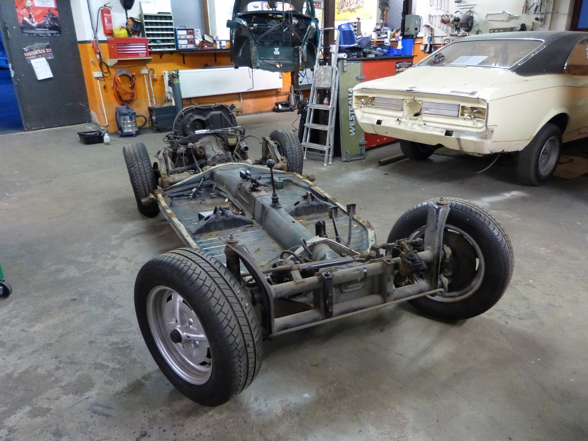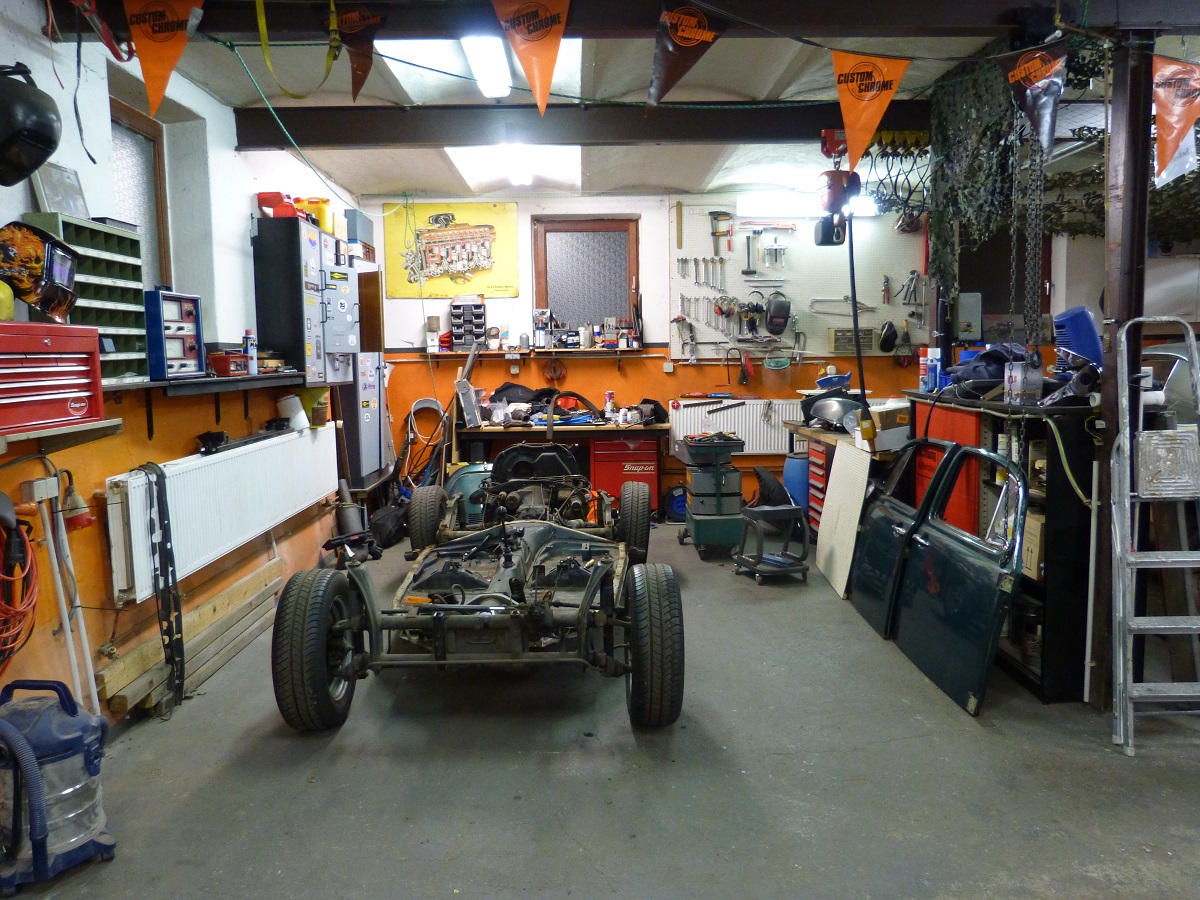 Um der Platzproblematik Herr zu werden, habe ich mir ein Gestell für das abgenommene Käferhäuschen überlegt, dass sich derzeit noch im Bau befindet. Mit diesem Rollgestell kann ich das Häuschen zum Bearbeiten/Schweißen bequem umherrollen und zum Lagern dann über der Bodengruppe parken!